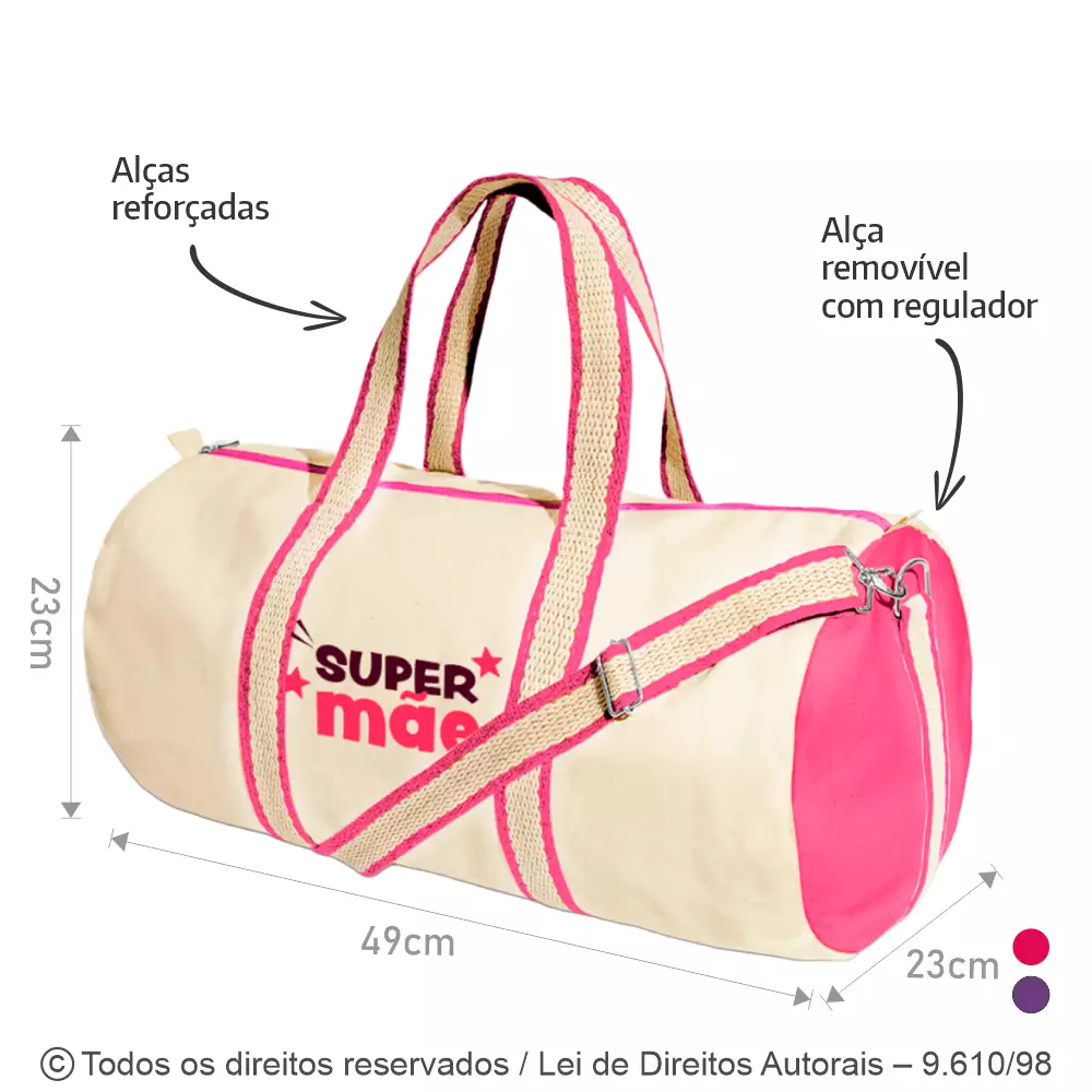 BOLSA DE VIAGEM EM LONA 240G MEDIDAS 49CM DE LARGURA X 23CM DE DIAMETRO. ALÇAS REFORÇADAS DE MÃO EM CADARÇO TRANÇADO E ALÇA TIRACOLO REMOVÍVEL COM MOSQUETÕES E REGULAGEM DE TAMANHO. DETALHE EM LONA COLORIDA NAS DUAS LATERAIS E FECHAMENTO COM ZÍPER.