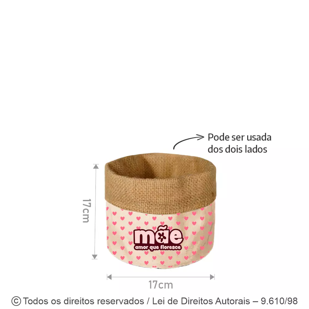 CACHEPOT DE LONA E JUTA DUPLA FACE MEDIDAS: 17CM DIÂMETRO X 17CM DE ALTURA, SEM DOBRAR. CONFECCIONADO EM TECIDO LONA DE ALGODÃO COR CRU E JUTA. PODE SER USADO DE VÁRIAS FORMAS: PARA DECORAR VASOS DE PLANTAS , ORGANIZADOR EM GERAL, PORTA PÃES ETC. PODE SER PERSONALIZADO COM A ARTE DO CLIENTE.