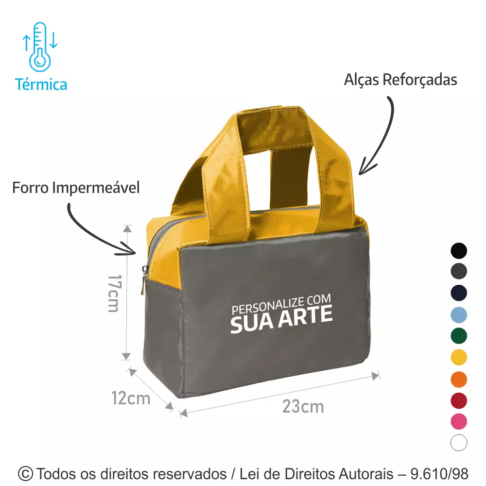 Bolsa termica de nylon pvc bicolor medidas: 23cm de largura x 17cm de altura x 12cm de lateral e profundidade, alças de mão, fechamento com zíper o cliente escolhe as cores que deseja.
