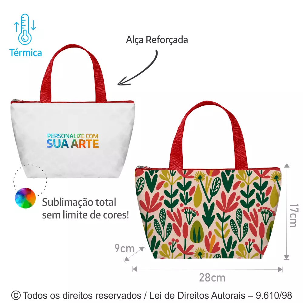 BOLSA TÉRMICA MEDIDAS: 28CM DE LARGURA X 17CM DE ALTURA X 9CM DE PROFUNDIDADE. FORRO TÉRMICO METALIZADO E ALÇAS DE MÃO EM CADARÇO DE NYLON TRANÇADO. CONFECCIONADA EM TECIDO POLIESTER BRANCO PARA QUE O CLIENTE ENVIE A SUA ARTE PARA IMPRESSÃO TOTAL EM SUBLIMAÇÃO SEM LIMITE DE CORES.